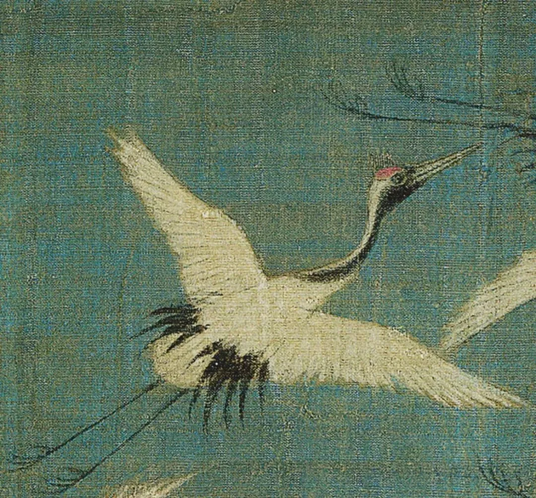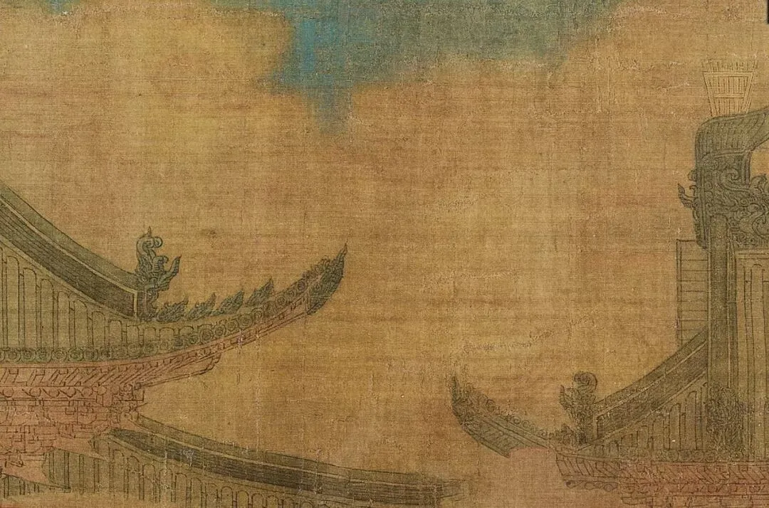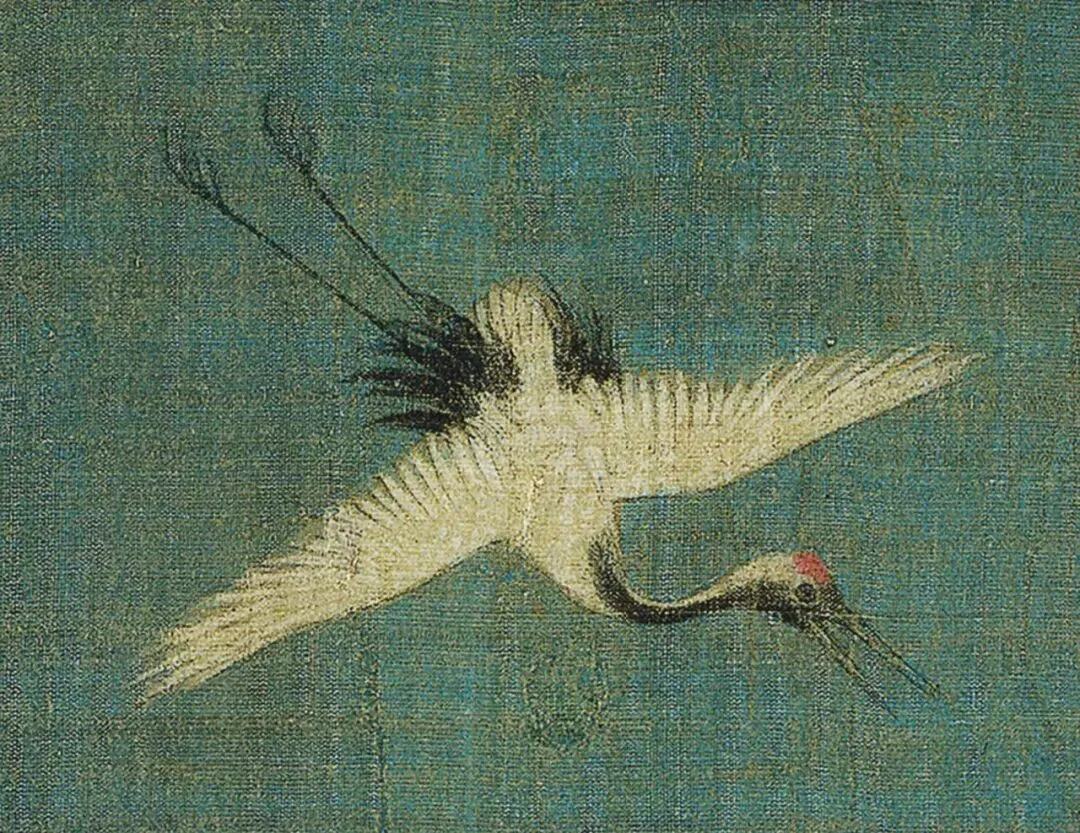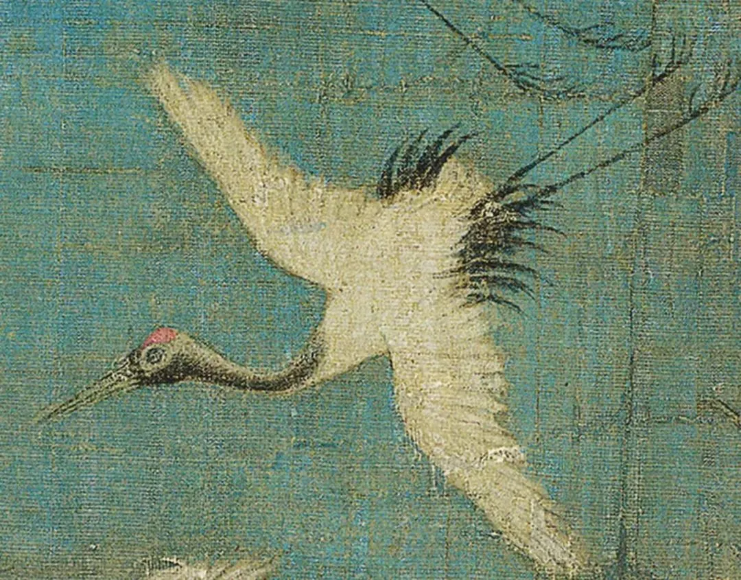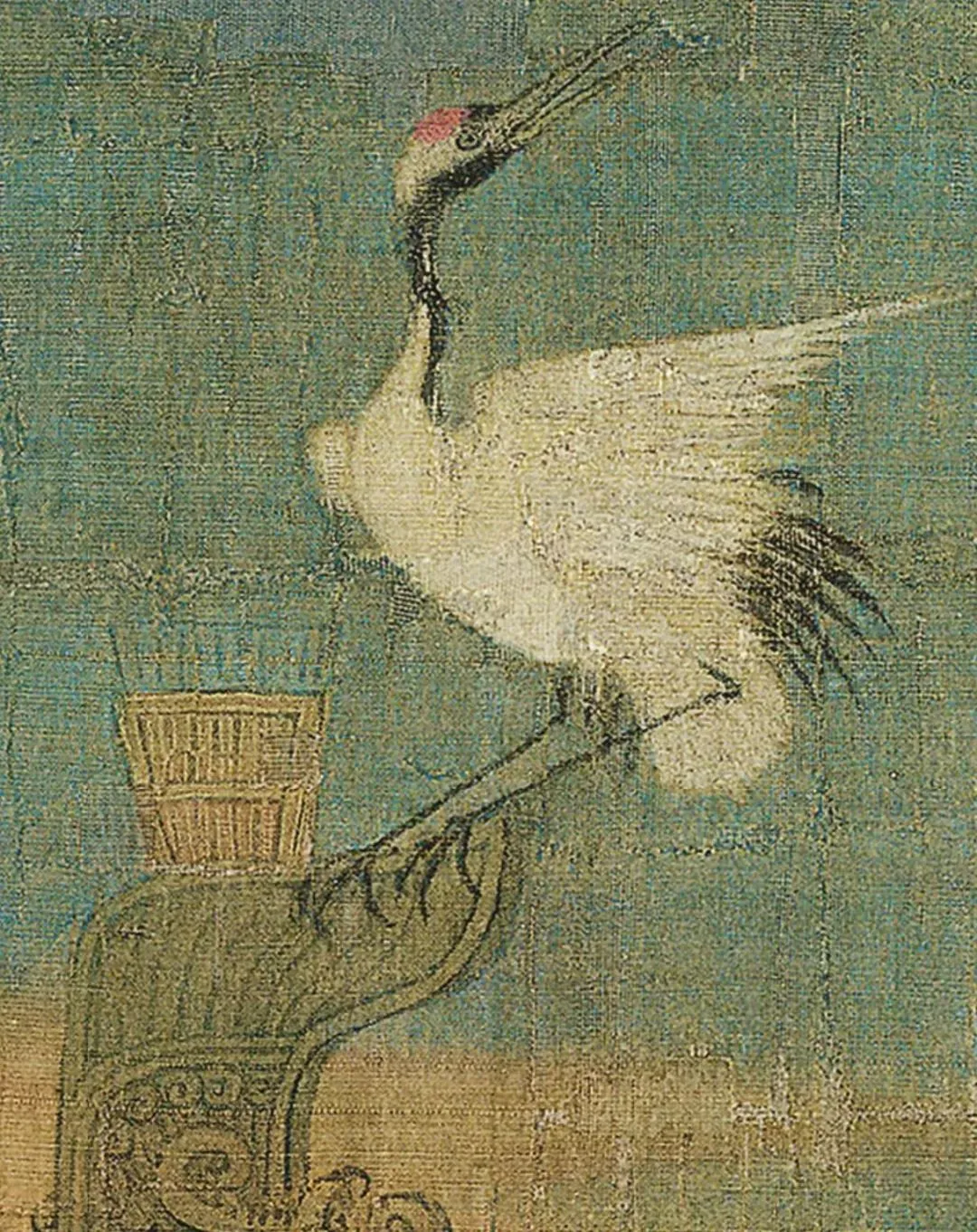徽宗赵佶信奉道教,以道治国, 自称道君皇帝。《瑞鹤图》画面充满了道家的宁静与预言。蓝天祥云,鹤舞于金色的殿顶,是徽宗对于天地人合一之解。一方面,皇宫殿宇端端正正置于画面下方,均衡对称,留出三分之二湛蓝天空,正大光远,大气天成,颇具皇家风范。另一方面,仙鹤有表明志向高洁、品德高尚之意,又是代表长生不死的神禽,以此“祥云瑞鹤”来隐喻王朝的吉祥。