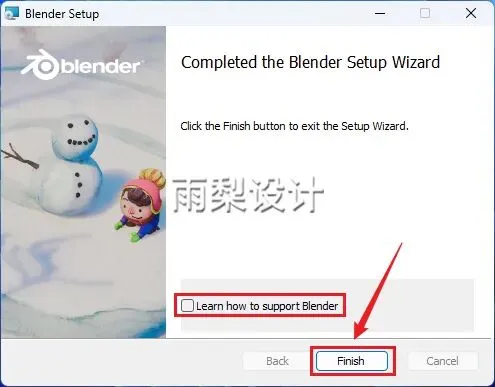 7.取消勾选【Learn how to support Blender】,点击【Finish】