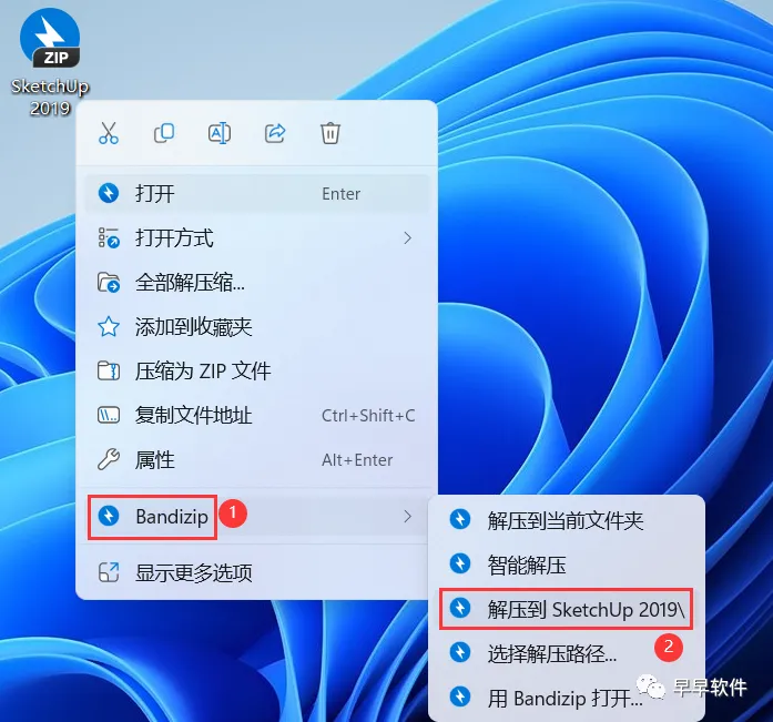 1、下载SketchUp 2019软件安装包到电脑上,右键选择【解压到SketchUp 2019\】