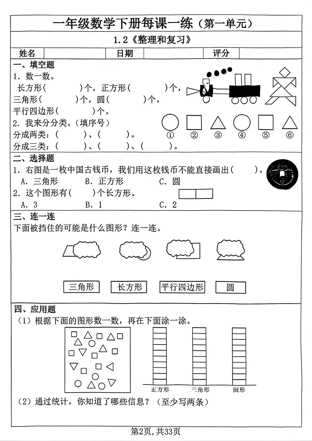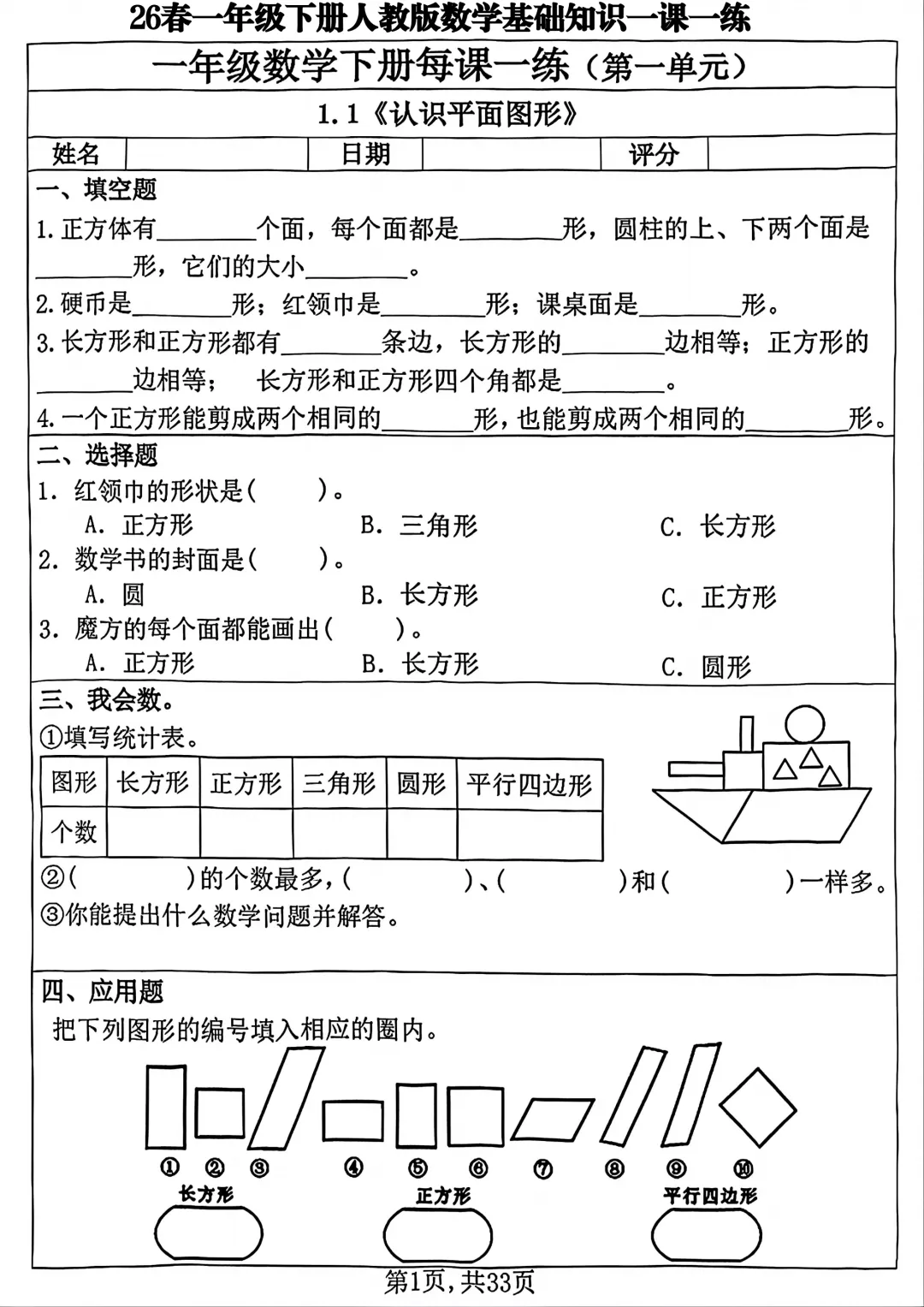 #一年级数学#人教版数学#26 春资料 #一课一练#基础知识#免费资料#可打印资料#小学数学