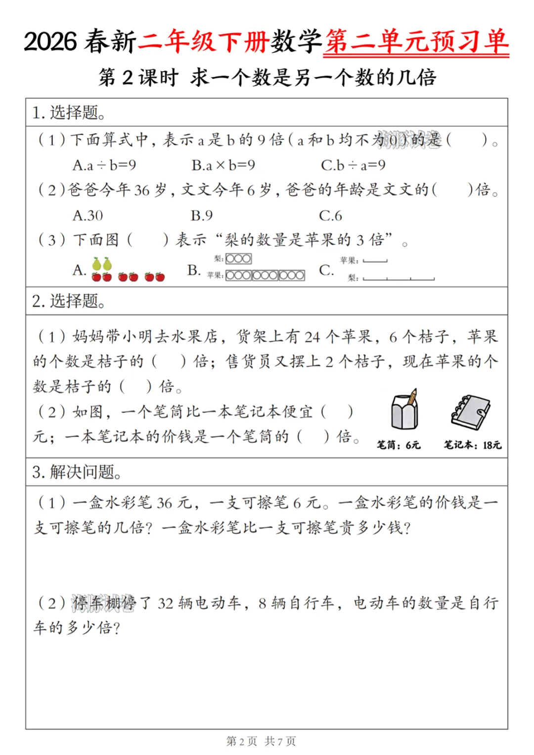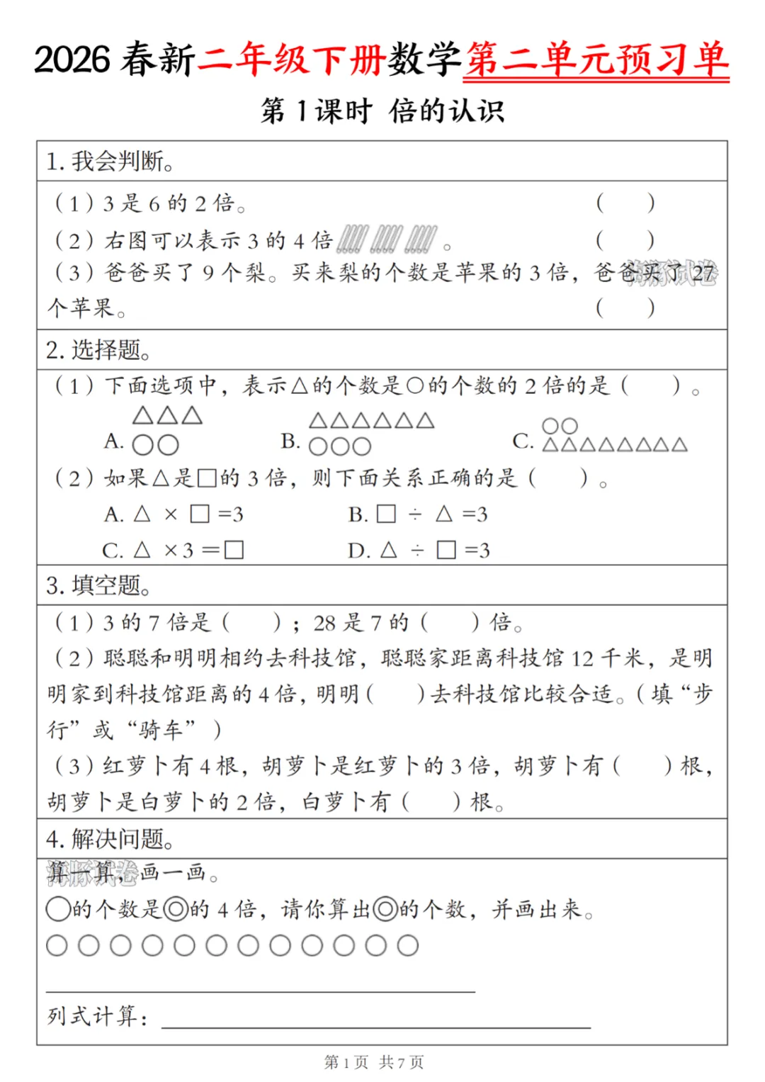 【免费下载】二年级(下)数学第二单元预习单,PDF电子版,共7页,可打印