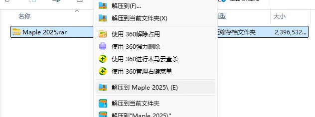 1.解压安装包:鼠标右击【Maple 2025】压缩包,选择电脑上安装的解压软件,点击【解压到Maple 2025 】。