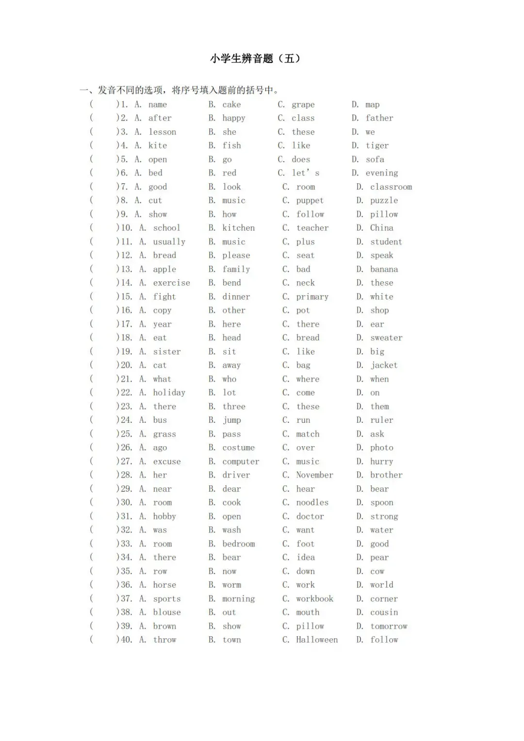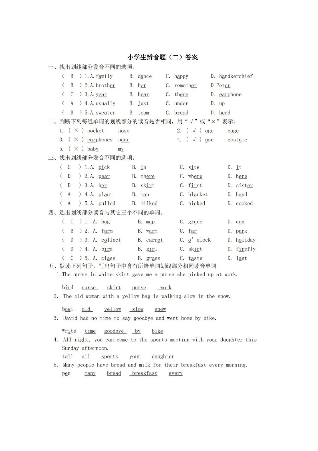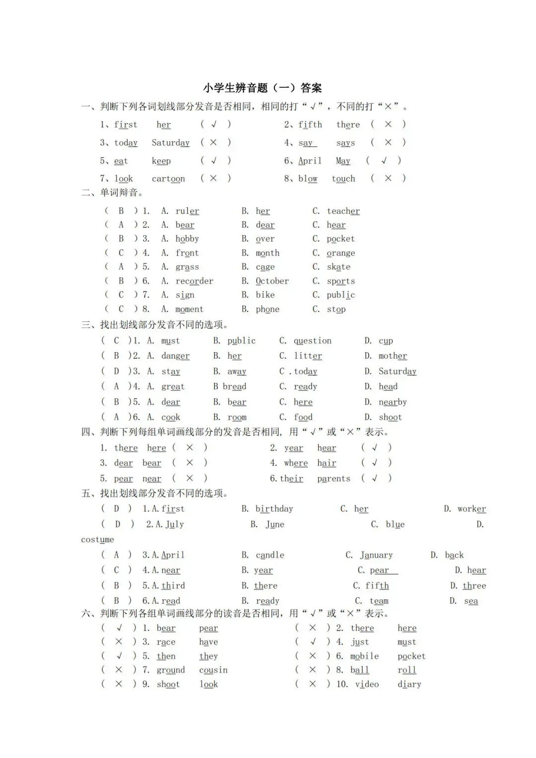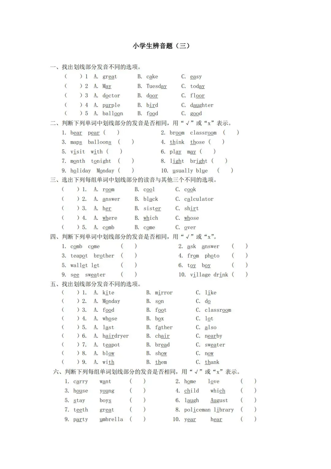 >小学英语辨音题专项练习,含答案,可免费下载