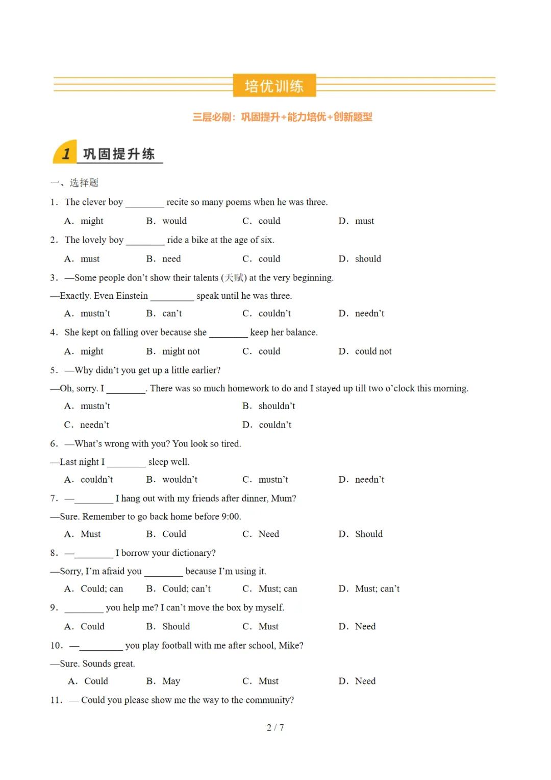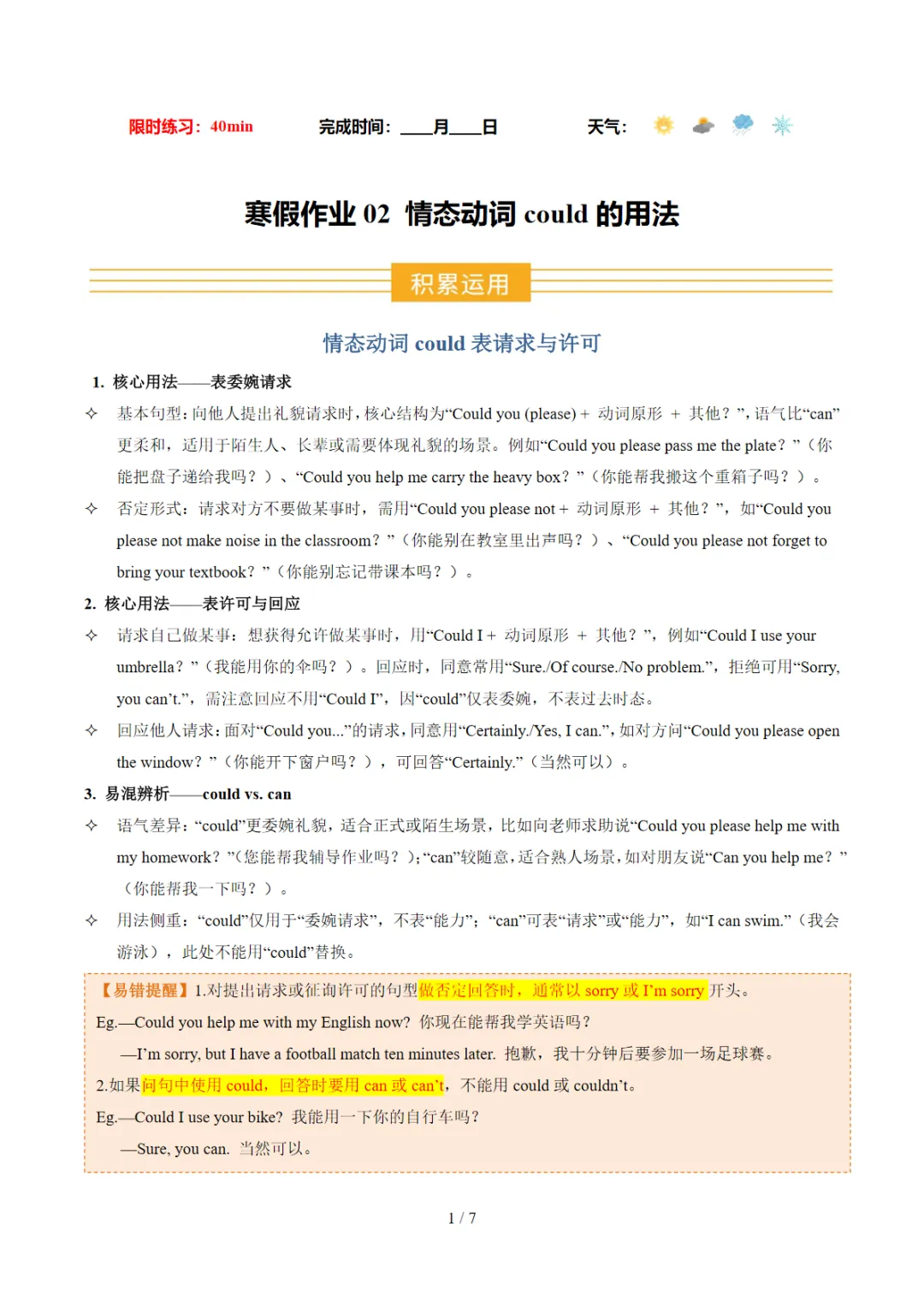 八年级(下)英语 寒假预习专题02 情态动词could(can)(巩固培优)https://pan.baidu.com/s/1RIF74uPXKzeO4XbvkXe2DQ?pwd=8888复制上边链接,微信里发给自己,即可点击保存