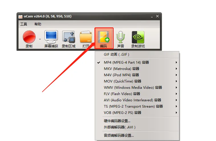 6.点击【编码】可以选择录制视频的文件个格式。