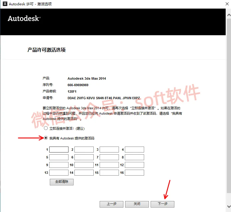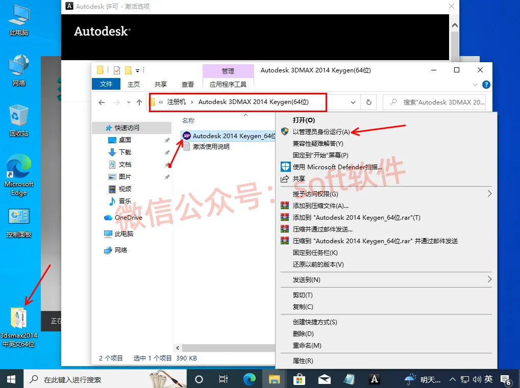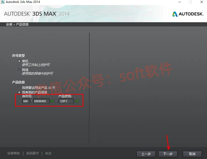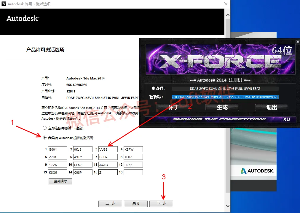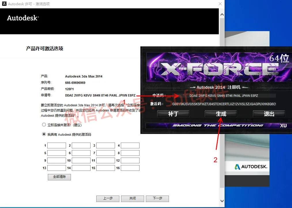 6,输入序列号:666-69696969。产品密钥:128F1。然后点击下一步。7,点击浏览可更改安装位置,如在D盘新建3dsmax2014文件夹。切记安装路径不要有中文字符,然后点安装10,此时桌面生成的3dsmax图标为英文版本。我们需要找到简体中文启动图标,教程如下:回到桌面,点击左下角开始图标,找到3dsmax2014 Simplified Chinese图标,鼠标左键按住不松手,拖动图标至桌面,即可生成桌面快捷方式。11,双击运行3dsmax2014 Simplified Chinese图标12,勾选我同意..........。点击我同意。14,点关闭。有时一次无法打开激活界面,多尝试重启程序即可。15,关闭程序,重新打开桌面3dsmax2014 Simplified Chinese启动程序17,勾选我具有Autodesk提供的激活码。不要关闭该页面。18,回到第一步解压生成的文件夹,进入注册机文件夹,再进入后缀64位文件夹里面,找到注册机程序,右键以管理员身份运行该程序,若无该文件,检查杀毒软件或者window安全中心是否关闭。解决办法为关闭杀毒和window安全中心,重新解压安装包)20,回到第17步打开的页面,Ctrl+C复制申请号,然后Ctrl+V粘贴申请号至注册机申请号栏,然后点击生成。21,Ctrl+C复制生成的激活码,然后Ctrl+V粘贴至下面的空格处,然后点下一步