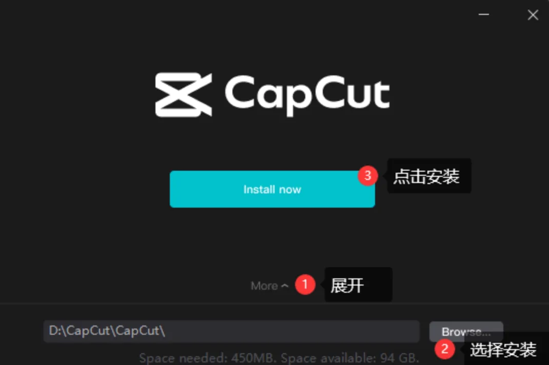 2.①展开更多②选择安装目录③点击 Install now