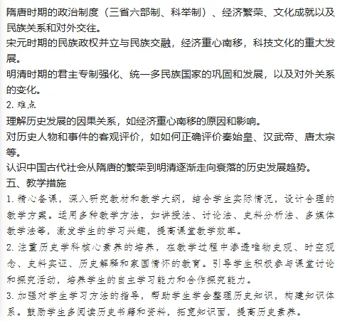 5.家国情怀:通过对中国古代辉煌历史成就的学习,激发学生的民族自豪感和自信心;通过对各朝代民族关系和对外交往的学习,培养学生的民族团结意识和开放的国际视野;通过对历史人物爱国事迹的讲述,增强学生的爱国情怀和社会责任感。