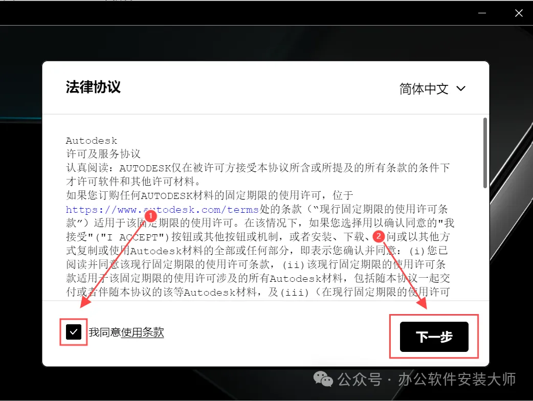 ①我同意使用条款前面打勾,点击下一步