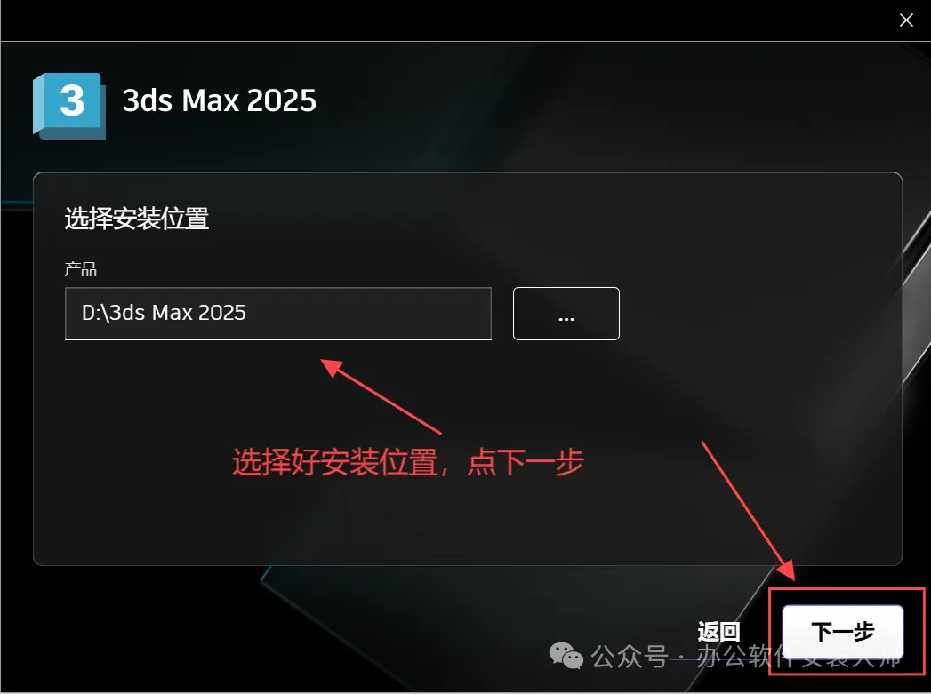 ②如果不想安装在C盘点击【...】更换安装位置,可以在D盘新建一个【3ds Max 2025】文件夹,选择好安装位置点击【下一步】