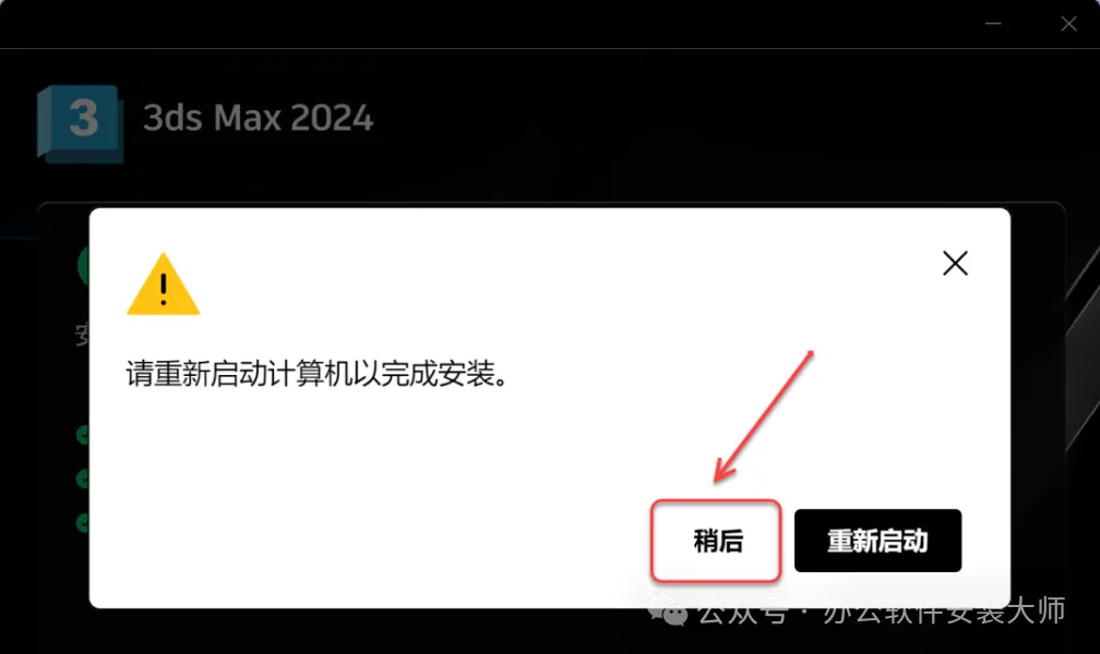 ④如提示重启点击【稍后】,安装完成直接【关闭窗口】,不要点开始