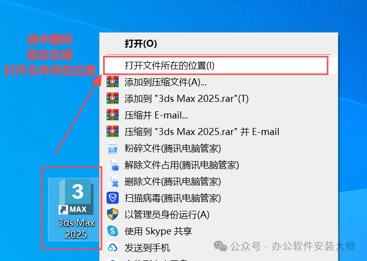 ②返回电脑桌面,找到3ds Max 图标,选中图标鼠标右键【打开文件所在位置】