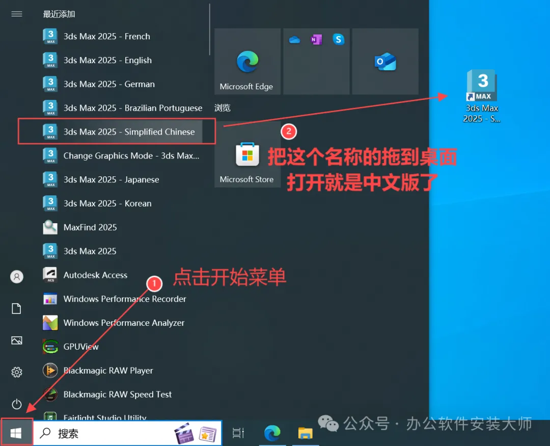 ⑥点击开始菜单,把3ds Max 2024 Simplified Chinese 拖动到电脑桌面(这个才是中文版),返回桌面双击图标就可以开始使用