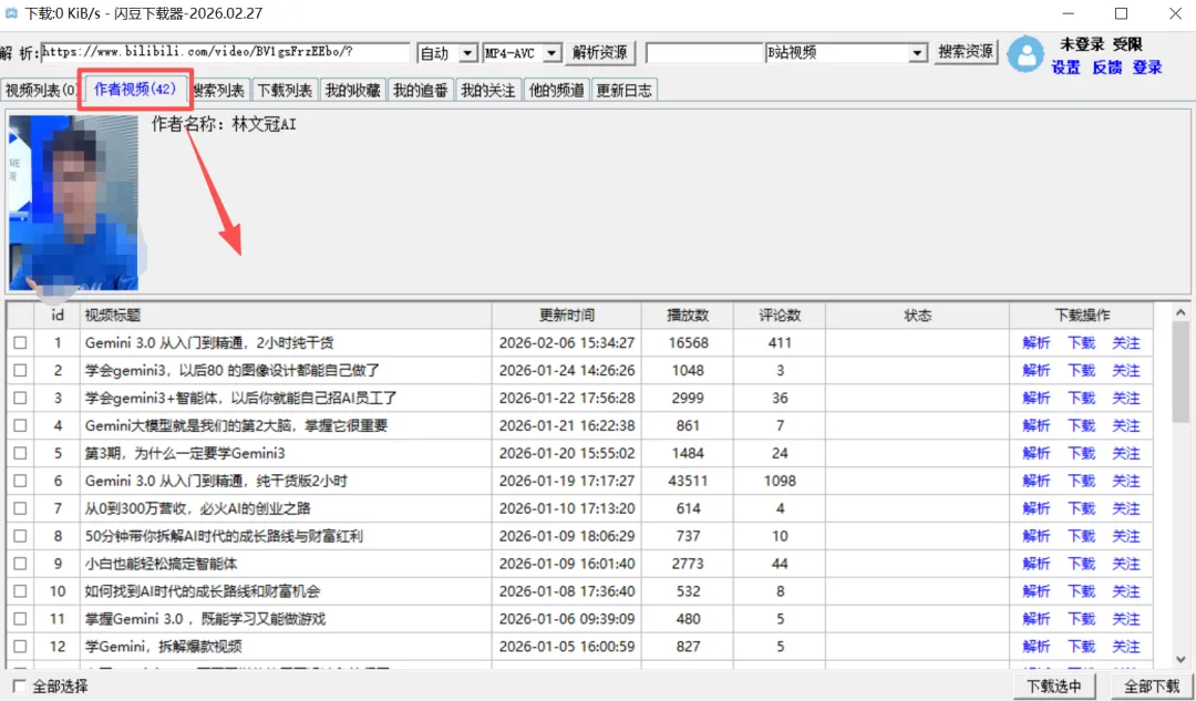比如我从B站随便找了一个视频,只要把链接放到软件的地址栏里,然后点击“解析”就会出现该视频信息软件的第二个tab“作者视频”,可以显示当前视频的作者下的其他视频。然后我又找了合集中的其中一个视频,你会发现,该视频合集下的所有视频,都会展示出来。其他平台操作方式没多大区别,支持单独视频和合集下载,没什么难度,就不给大家演示了。功能特点