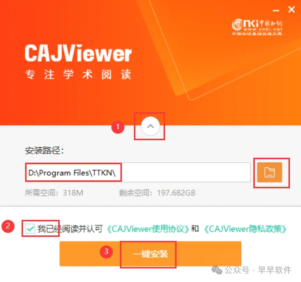 4、点击【展开按钮】,软件默认安装在C盘,可自定义更改软件安装位置,这里小编选择安装在D盘,勾选【我已阅读…】,再点击【一件安装】
