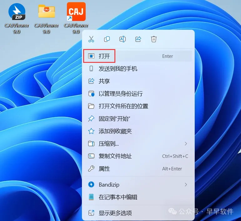 7、回到桌面,右键桌面上的【CAJViewer 9.0软件图标】,点击【打开】