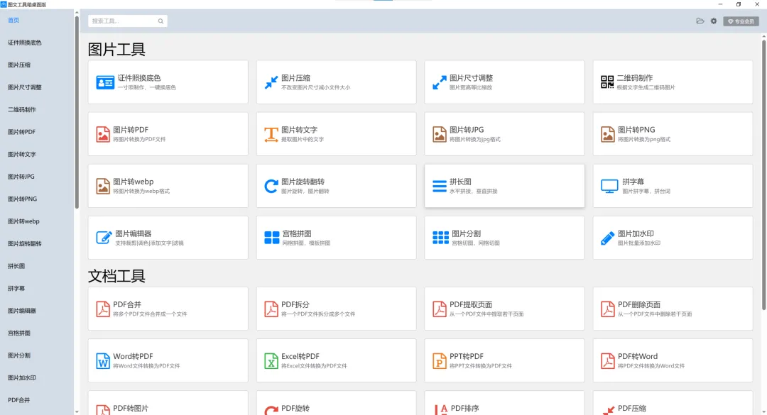 图文工具箱桌面版分为免费会员和专业会员,两者的主要区别是:免费会员每日每个功能有3次试用机会;专业会员可解锁全部功能,可永久使用,无次数限制。