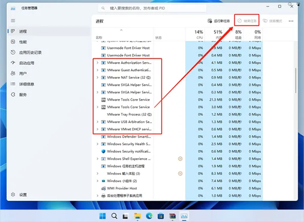 按快捷键【ctrl+shift+esc】打开任务管理器,找到所有VMware程序将其强制关闭