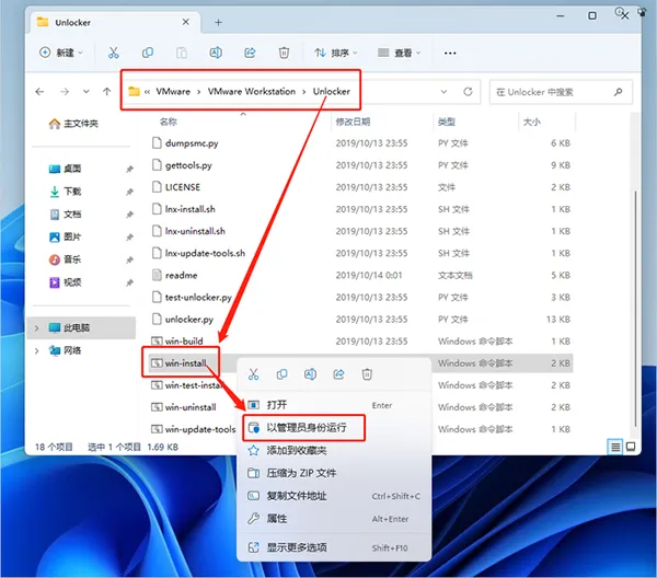 6、打开【unlocker】文件夹,找到【win-install.exe】文件,右键【以管理员身份运行】