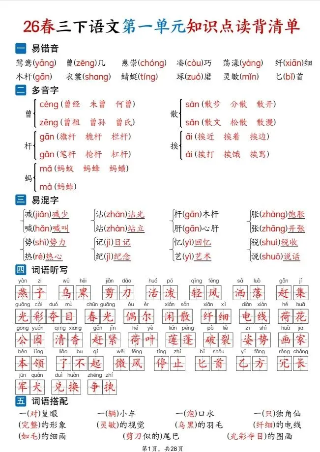 今天给大家整理了26春三下语文1-8单元知识点读背清单(28页),转发给朋友或班级群,受益更多人,帮助孩子学习!