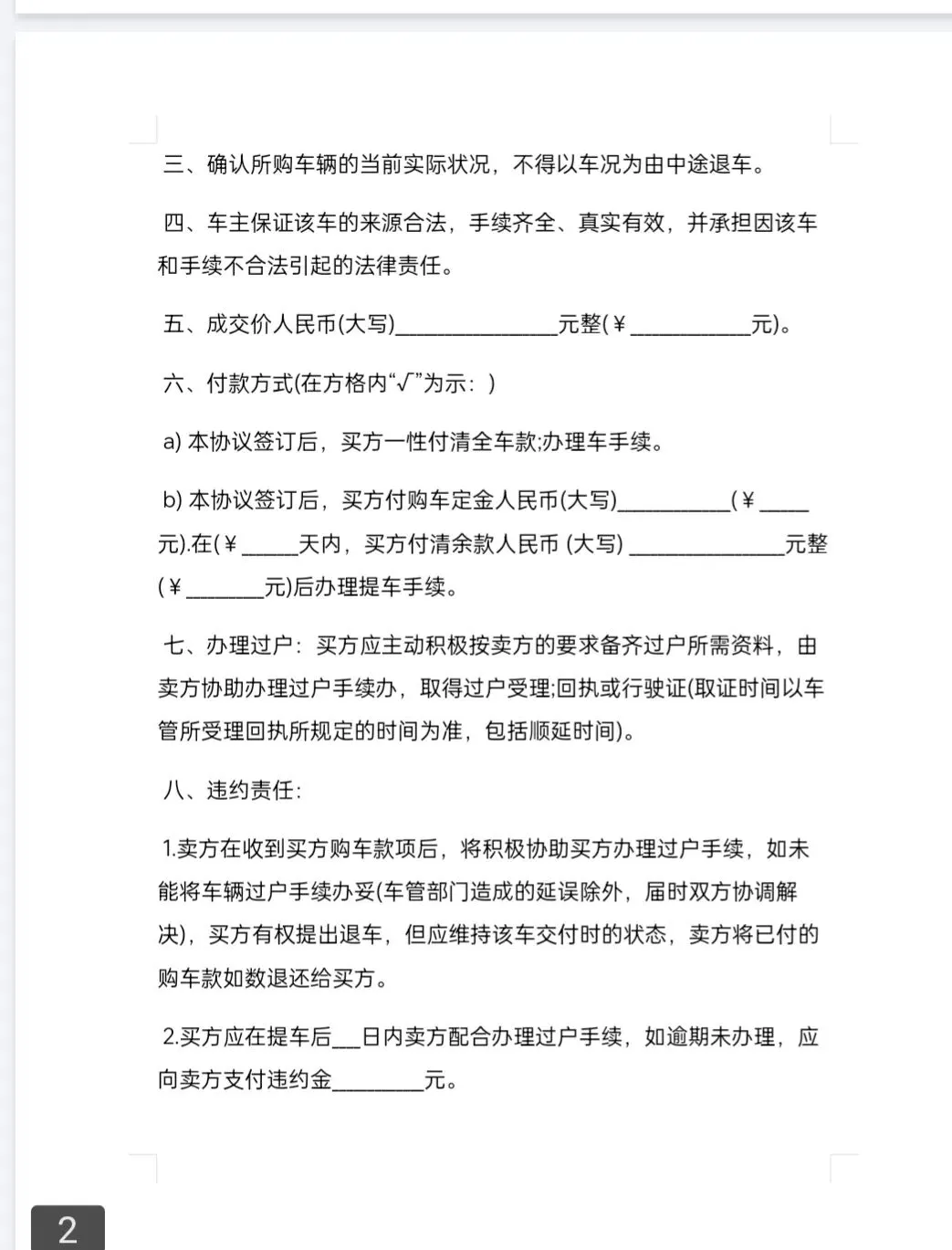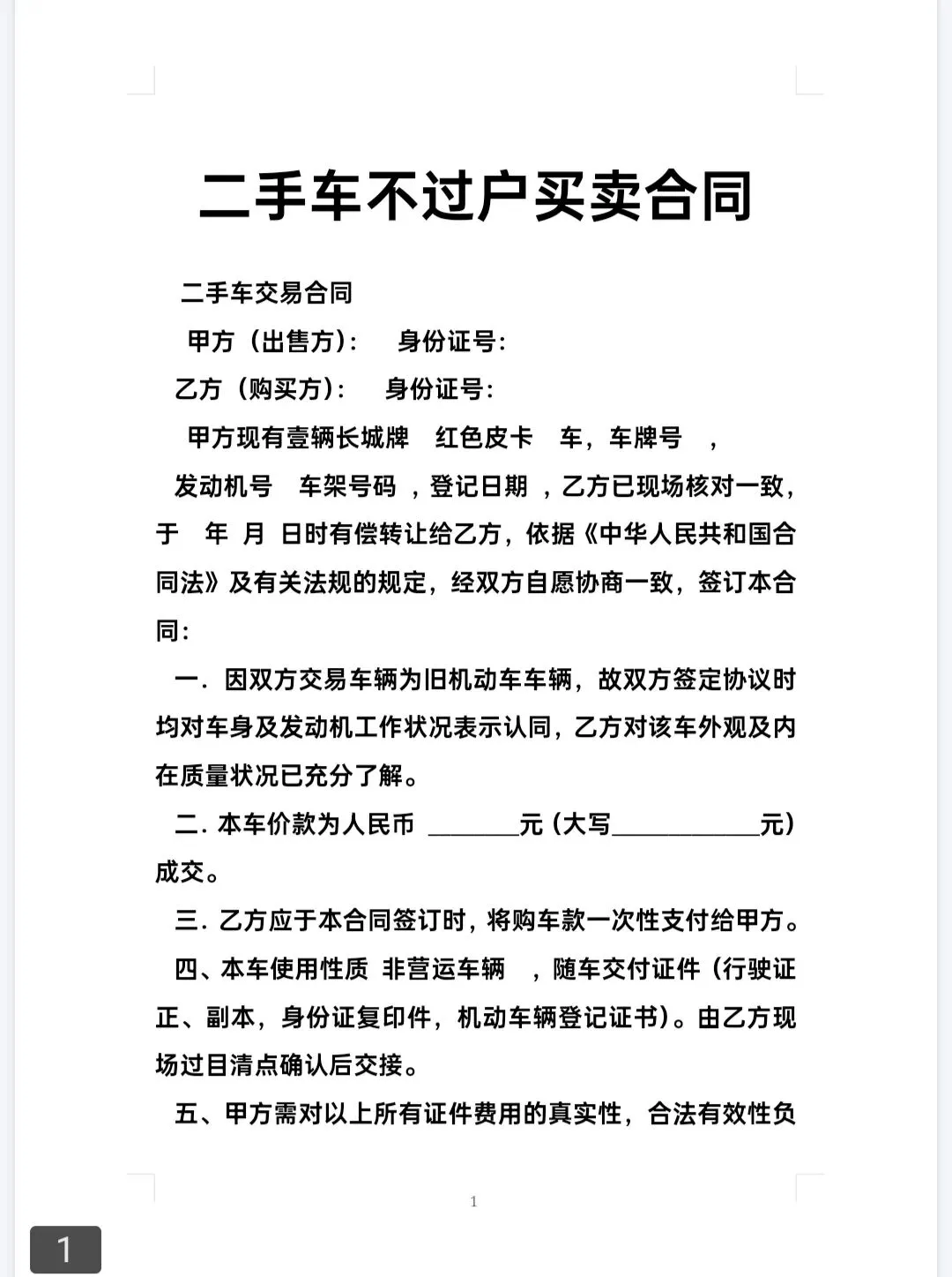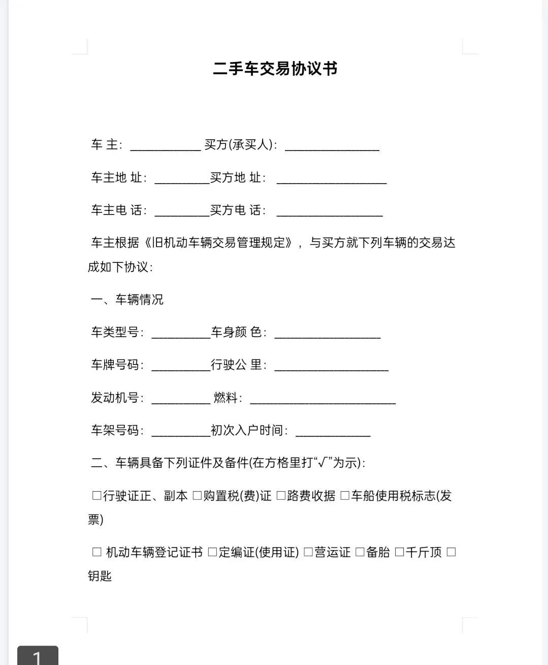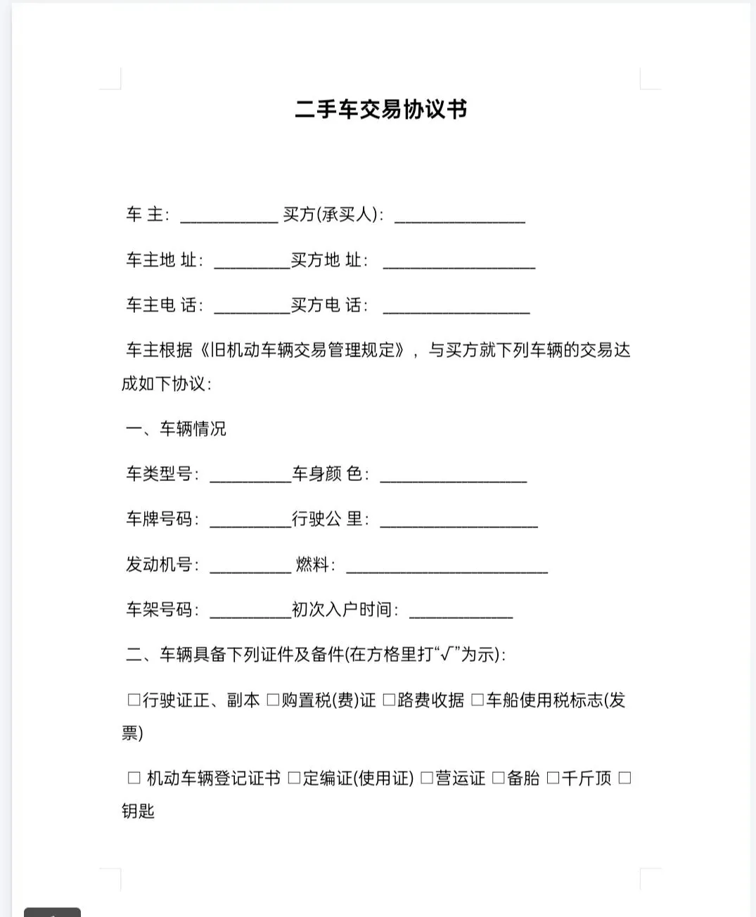 二手车交易水太深,口头约定全是坑!事故车、调表车、过户扯皮……没一份正规合同,维权根本没依据。今天分享通用版二手车买卖合同,覆盖车况承诺、付款、过户、违约追责全条款,个人对个人、商家交易都能用,打印即签,安心交易✅,建议收藏保存