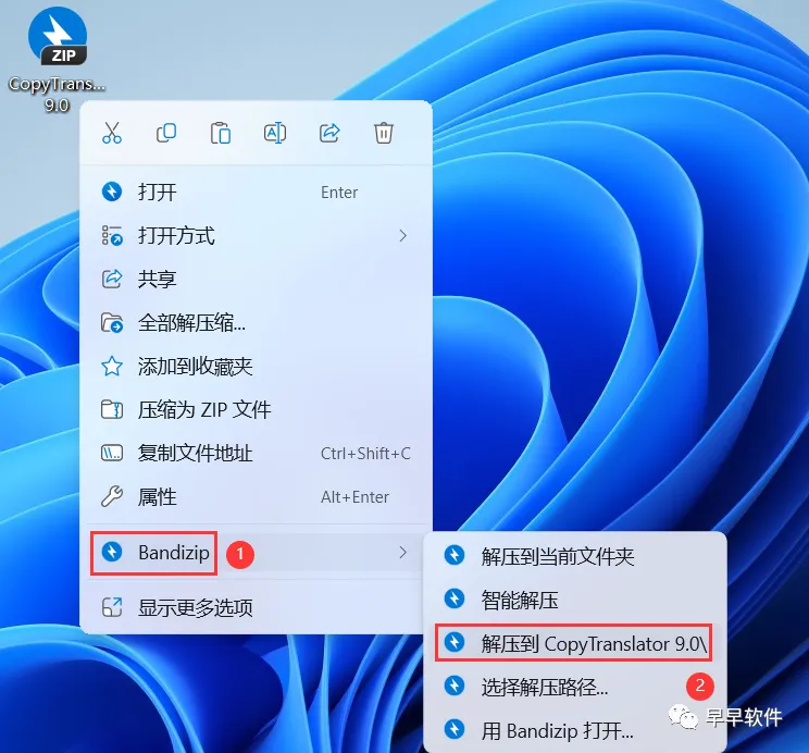 1、下载CopyTranslator 9.0软件安装包到电脑上,右键选择【解压到CopyTranslator 9.0\】