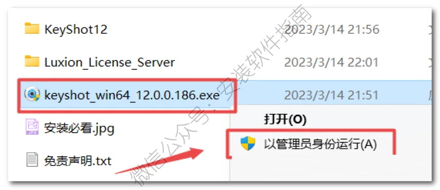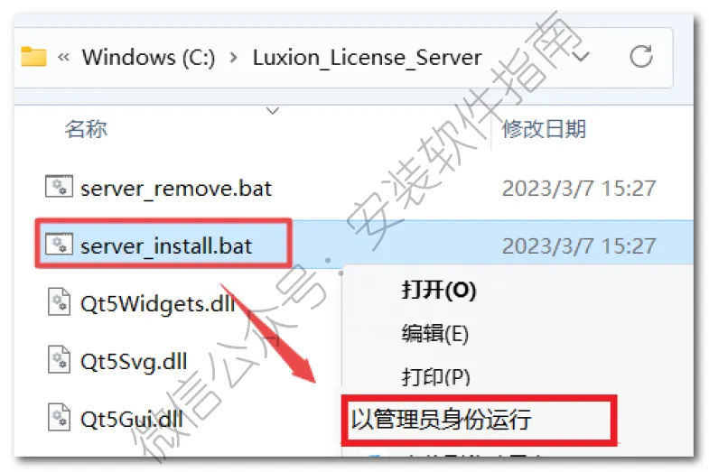 12.双击打开复制过来的“Luxion_License_Server”文件夹,鼠标右键点击“server_install.bat”选择“以管理员身份运行”(运行前请关闭电脑中的杀毒软件)