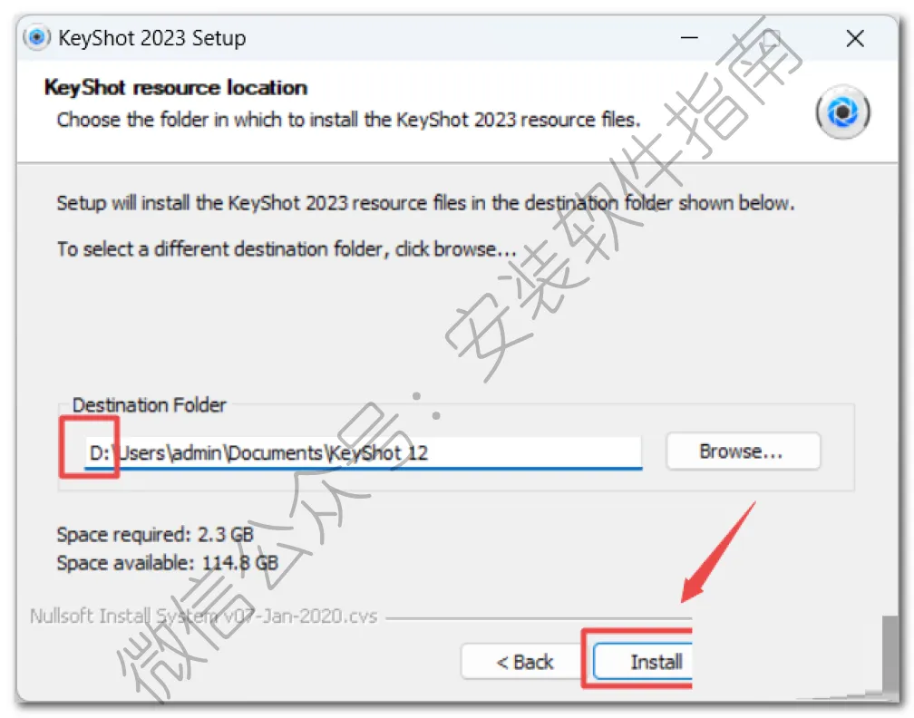 7.选择资源文件安装路径,建议和教程中的保持一致,本例安装到D盘(将路径地址中的首字符C改为D表示安装到D盘,或者可以在其它磁盘里创建一个新的文件夹,安装路径不要出现中文),点击”Install“