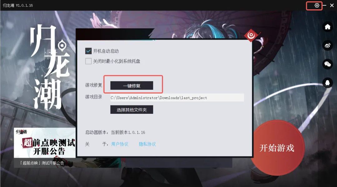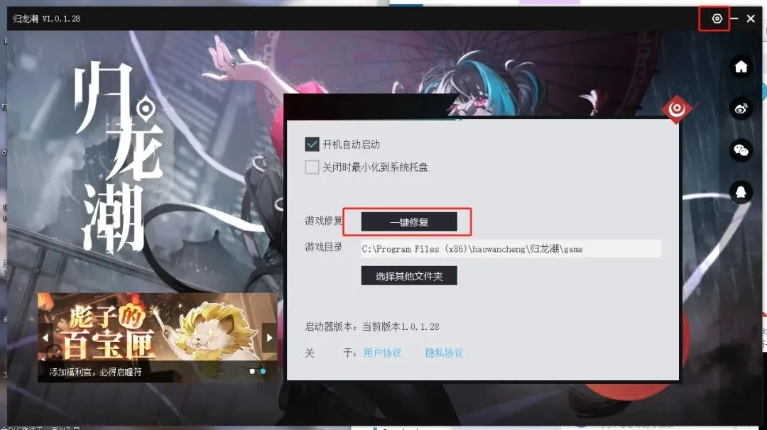 A:如遇以上问题,可以尝试关闭游戏客户端并在启动器界面点击右上角设置》一键修复按钮尝试解决,若一直报错,请尝试重新安装启动器。