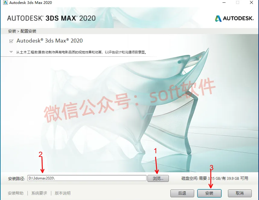 5,点击浏览可更改安装位置,如在D盘新建3dsmax2020文件夹。切记安装路径不要有中文字符,然后点安装