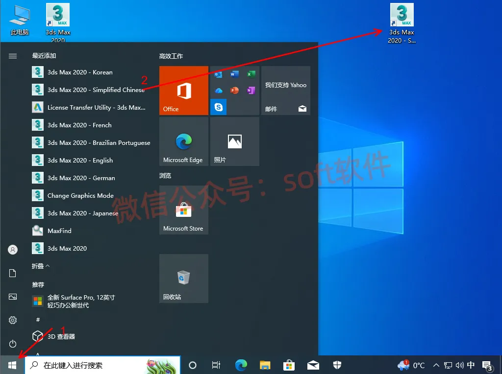 8,此时桌面生成的3dsmax图标为英文版本。我们需要找到简体中文启动图标,教程如下:回到桌面,点击左下角开始图标,找到3dsmax2020 Simplified Chinese图标,鼠标左键按住不松手,拖动图标至桌面,即可生成桌面快捷方式。