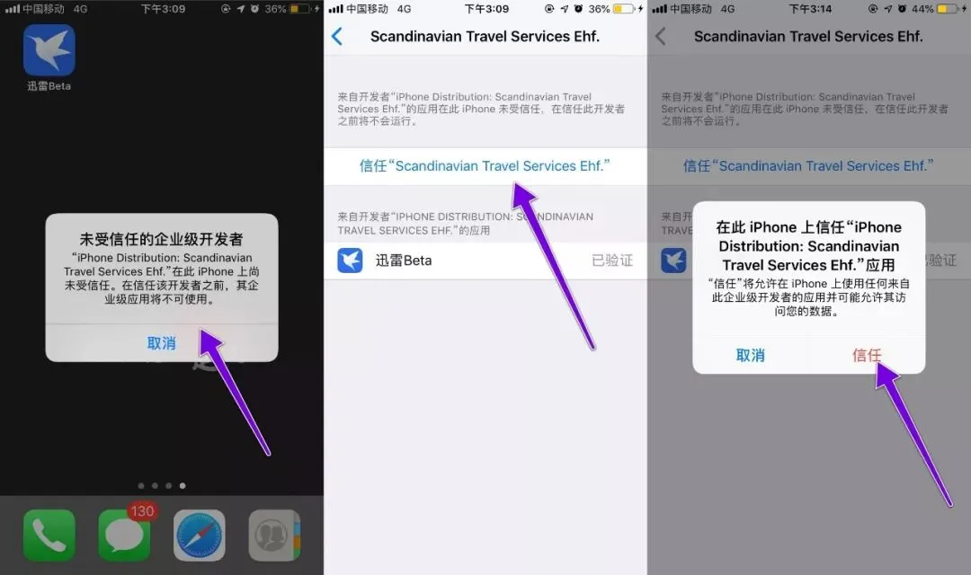 由于使用的是企业证书,安装好软件后需要信任才能使用,打开「设置」→「通用」→「描述文件(与设备管理)」→「找到相应证书」→「信任」就可以正常的使用了。