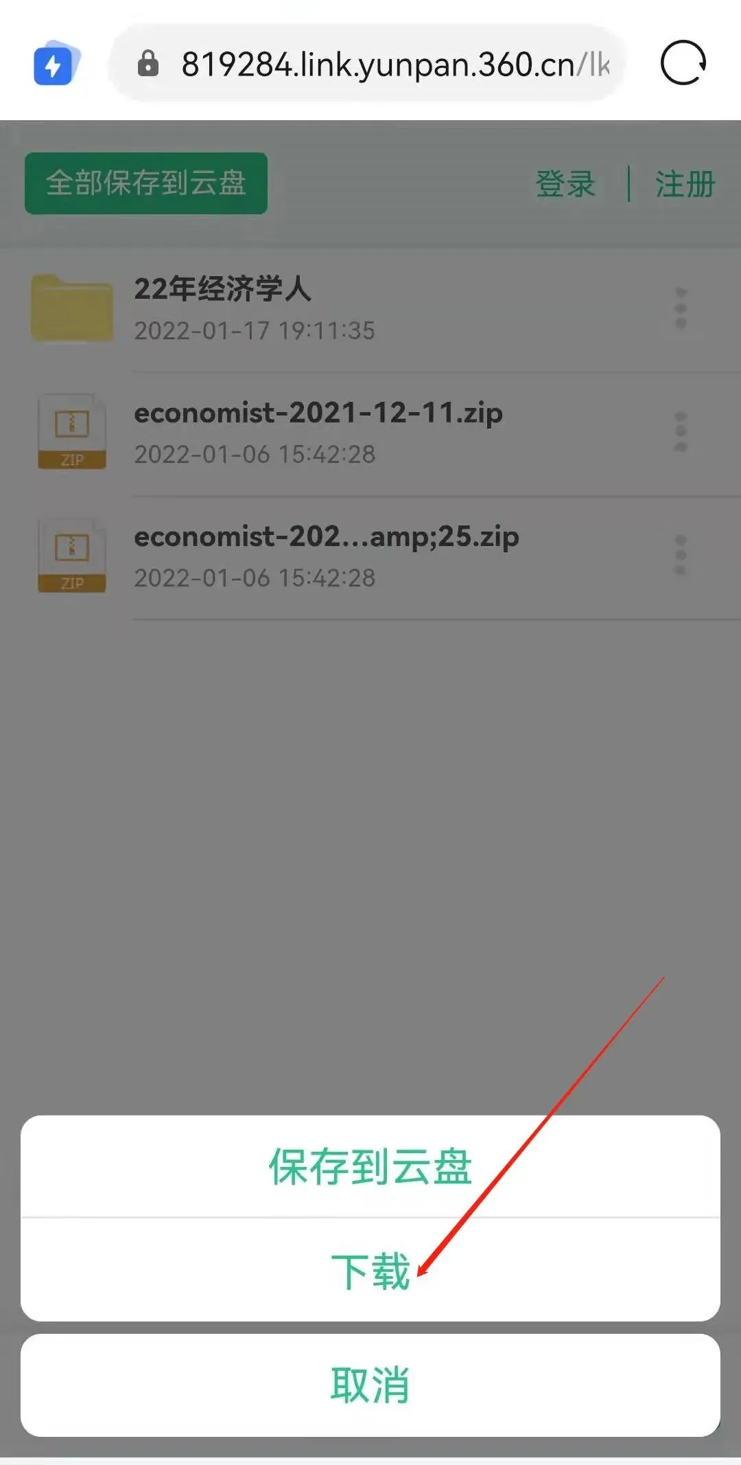 第二步:点击文件右侧的三个竖向点,选择“下载”文件(此处压缩包和单个文件可以直接下载,文件夹不能直接下载,需要打开具体文件逐个下载)注意:不要选择“保存到云盘”此步骤需要登陆360安全云盘。
