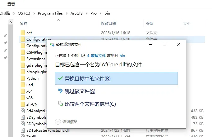 复制AfCore.dll 文件到 Pro 安装目录 C:\Program Files\ArcGIS\Pro\bin,并确认覆盖