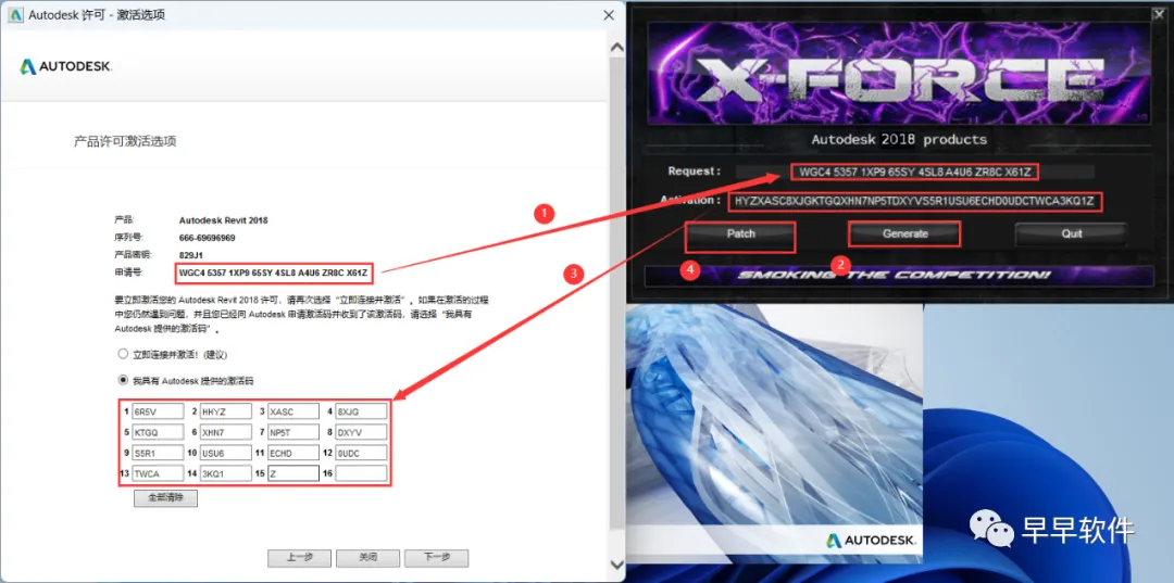 19、打开软件界面,将软件的【申请号】填入到程序的【Requset】内,再点击【Generate】,将程序的【Activation】填入到软件的【激活码】内,再点击【Patch】