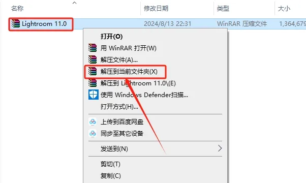 1.打开下载的Lightroom安装包,鼠标右击压缩包,选择【解压到当前文件夹】。