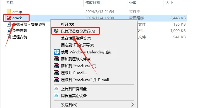 7.返回到解压的文件夹,鼠标右击【crack】注册机,选择【以管理员身份运行】。