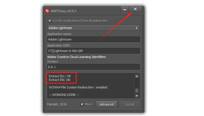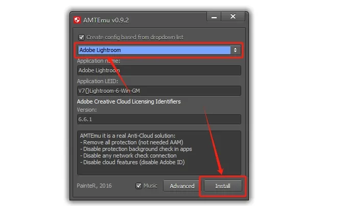 8.点击注册机第一个选项框,下拉选择【Adobe Lightroom】,然后点击【Install】。。