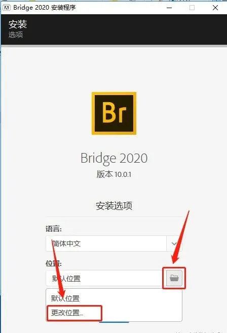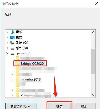 7.设置软件的安装路径,建议安装到除C盘以外的磁盘,可在E盘或者其它磁盘里面创建一个新的【Bridge CC2020】文件夹,设置好安装路径后点击【确定】。