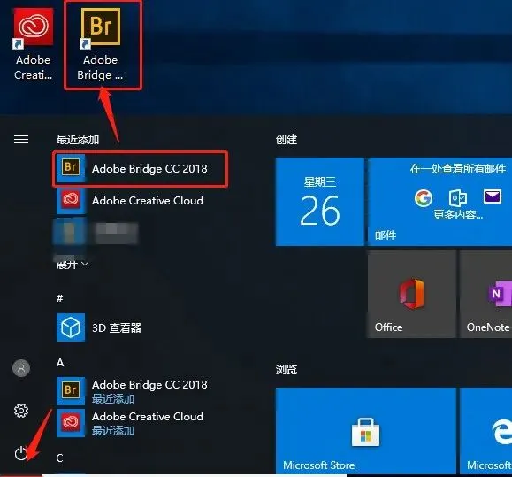 11.点击桌面左下角的【开始菜单】,找到【Adobe Bridge CC 2018】,往桌面拖动即可创建桌面快捷方式。