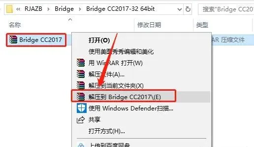 1.打开下载的软件安装包,鼠标右击【Bridge CC2017】压缩包,选择【解压到Bridge CC2017】。