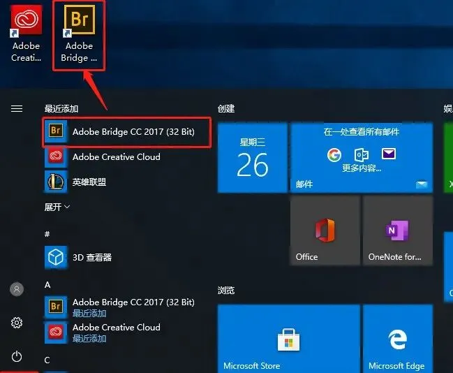 10.点击桌面左下角的【开始菜单】,找到【Adobe Bridge CC 2017 (32 Bit)】,往桌面拖动即可创建桌面快捷方式。