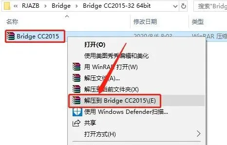 1.打开下载的软件安装包,鼠标右击【Bridge CC2015】压缩包,选择【解压到Bridge CC2015】。