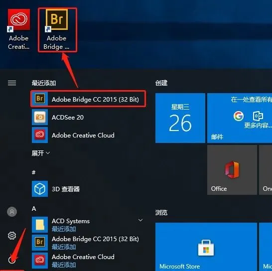 8.在桌面左下角的开始菜单中找到【Adobe Bridge CC 2015 (32 Bit)】,往桌面拖动即可创建桌面快捷方式。