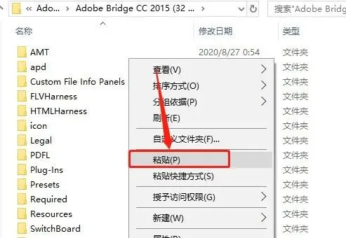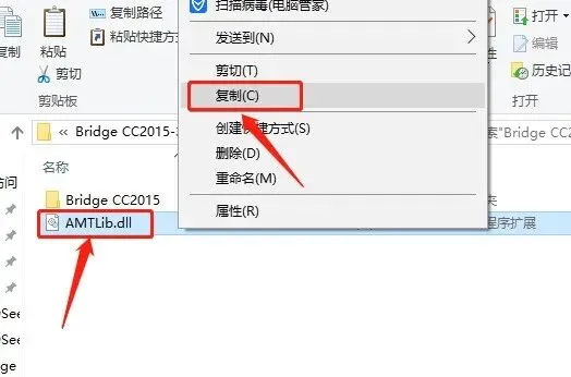 9返回到开头解压的【Bridge CC2015】文件夹,鼠标右击【AMTLib】文件选择【复制】。