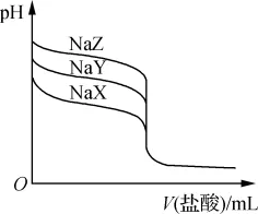3. 常温下,用0.100 0mol/L盐酸分别滴定20.00mL浓度均为0.100 0mol/L三种一元弱酸的钠盐(NaX、NaY、NaZ)溶液,滴定曲线如图所示。下列判断错误的是()