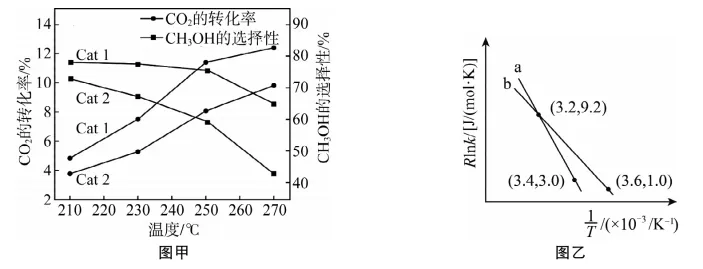 一定条件下向某刚性容器中充入物质的量之比为1∶3的CO2和H2发生上述反应,在不同催化剂(Cat1,Cat2)下经相同反应时间,CO2转化率和甲醇的选择性[甲醇的选择性=n(CO)+n(CH3OH)×100%]随温度变化如图甲所示。