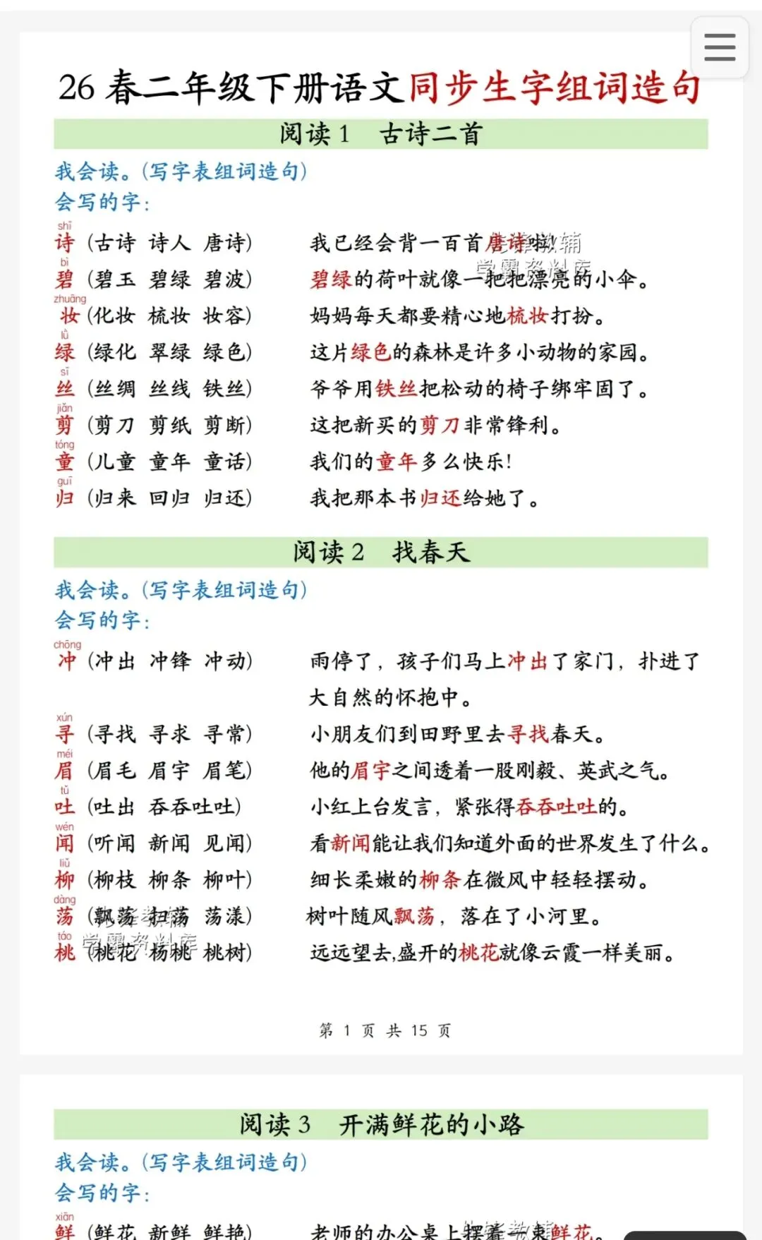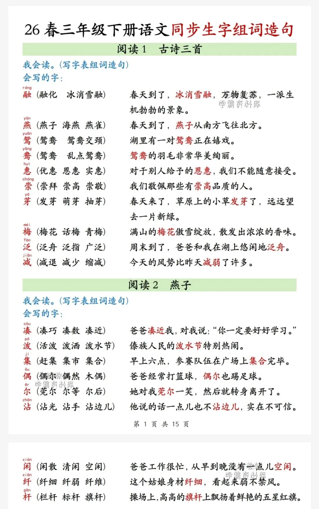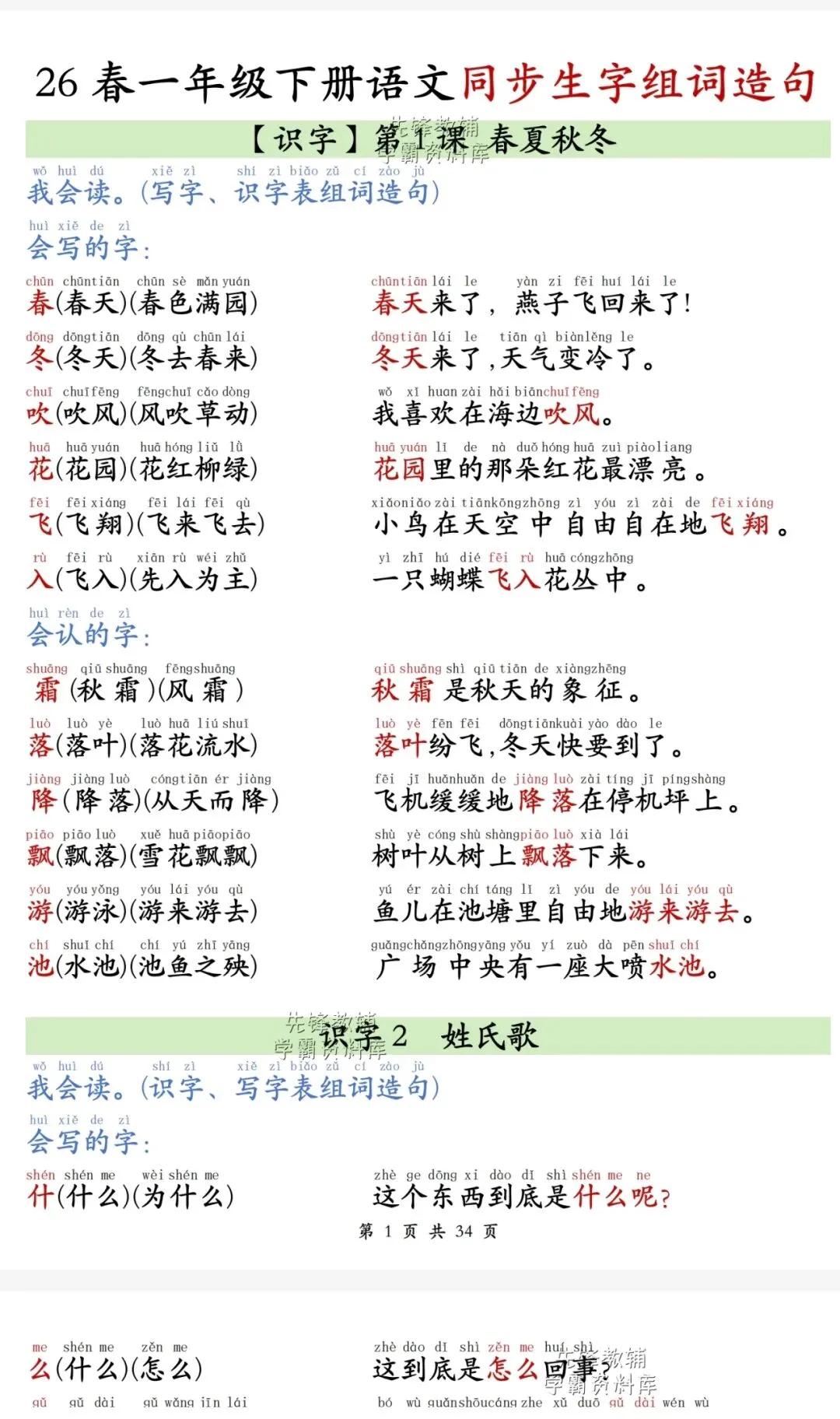 今天给大家整理了26春一年级下册语文同步生字组词造句1-4单元,转发给朋友或班级群,受益更多人,帮助孩子学习!