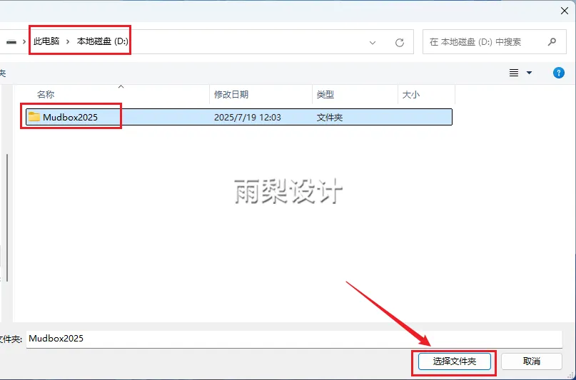 6.先选择【本地磁盘D】,新建一个文件夹(名称不能是中文);并点击【选择文件夹】