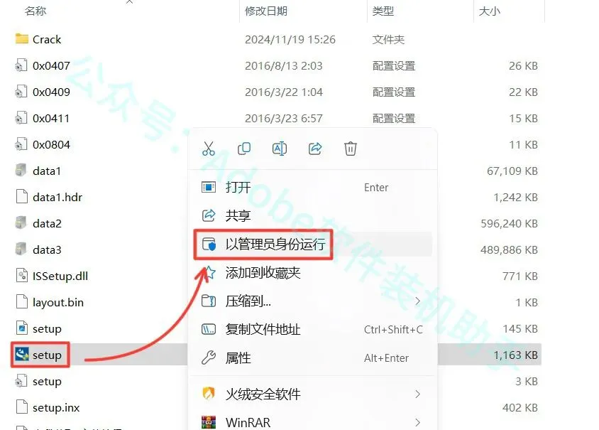 3.双击打开解压后的文件夹,鼠标右击【setup】选择【以管理员身份运行】。